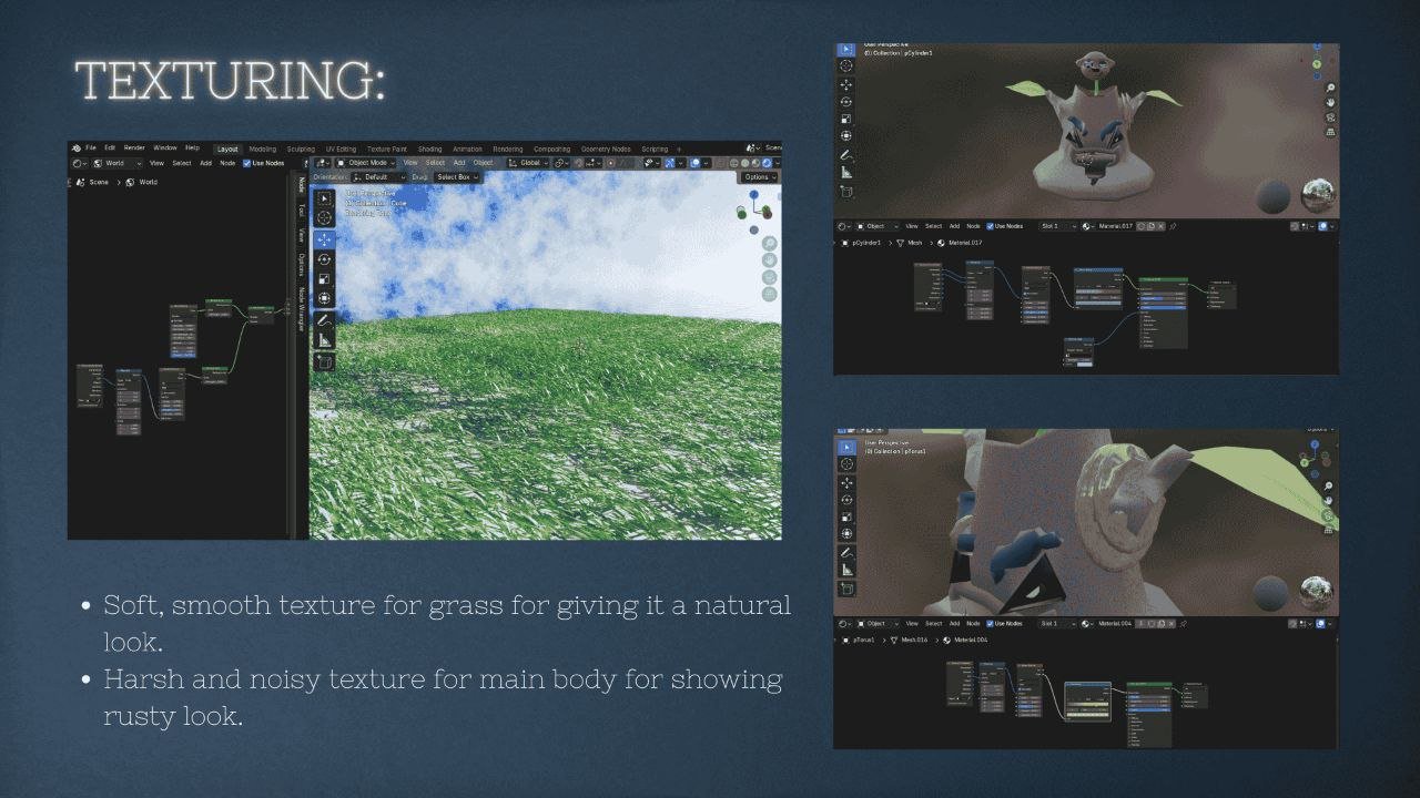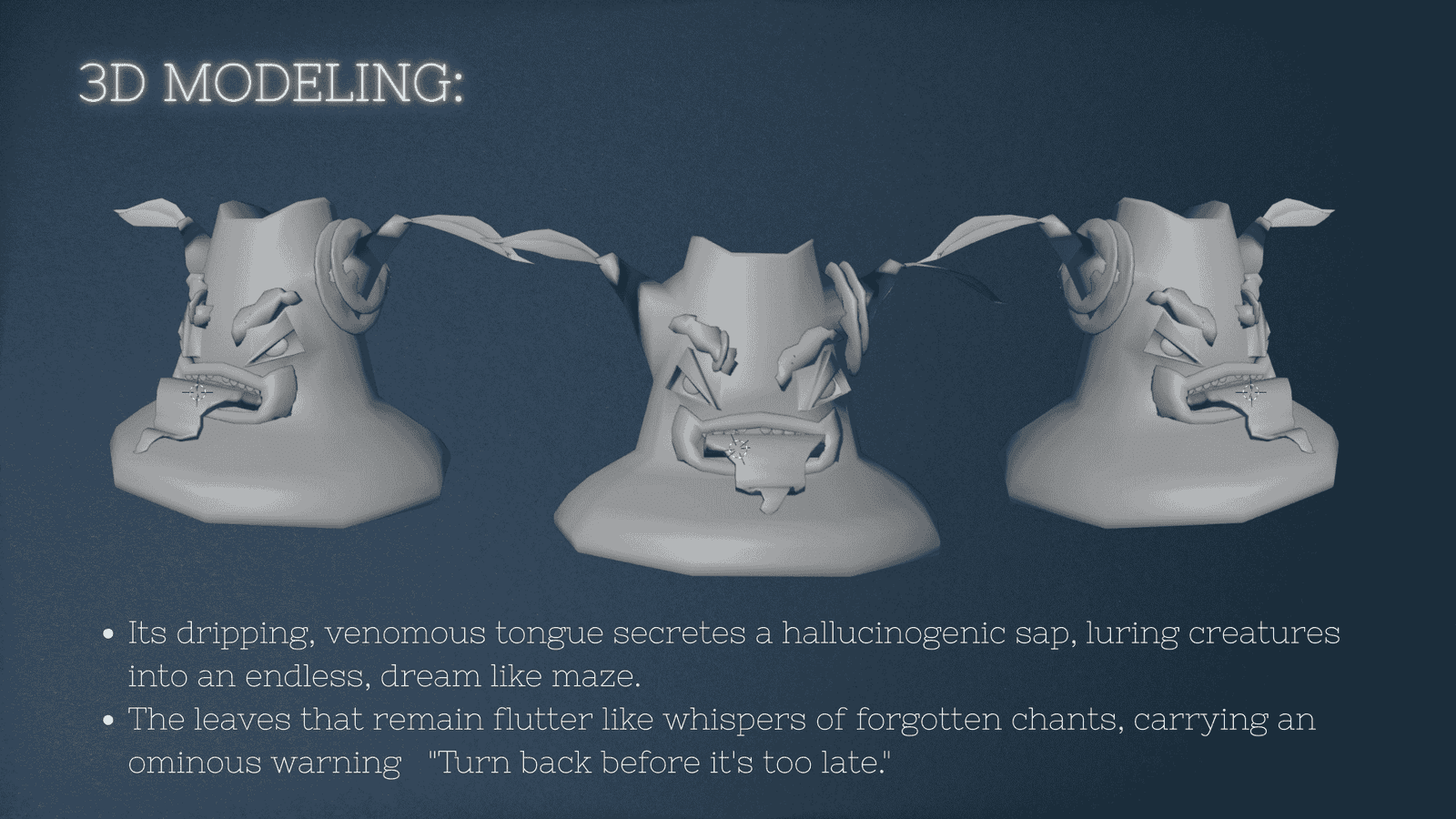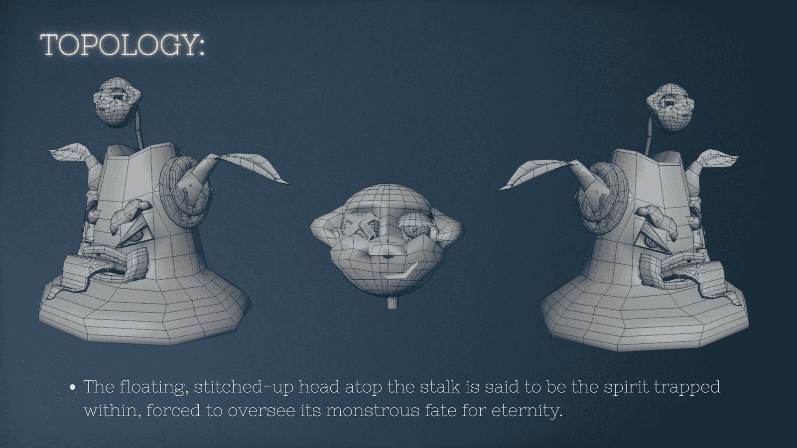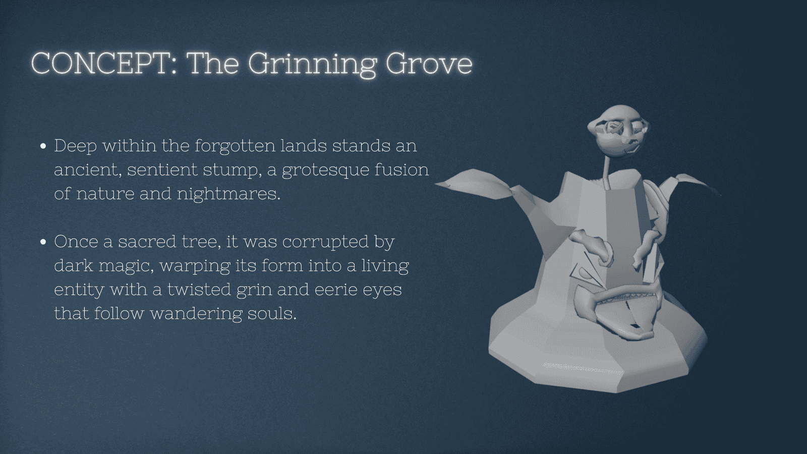 The Grinning Grove is a dark fantasy 3D prop of a cursed, sentient tree stump brought to life through my 3D modelling and texturing. With a twisted grin, floating stitched-up head, it feels like something straight out of a nightmare forest. This piece explores expressive shapes, stylized topology, and bold materials to tell a haunting visual story